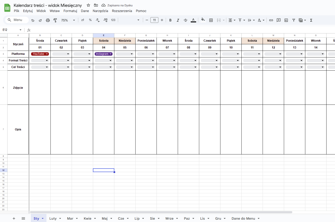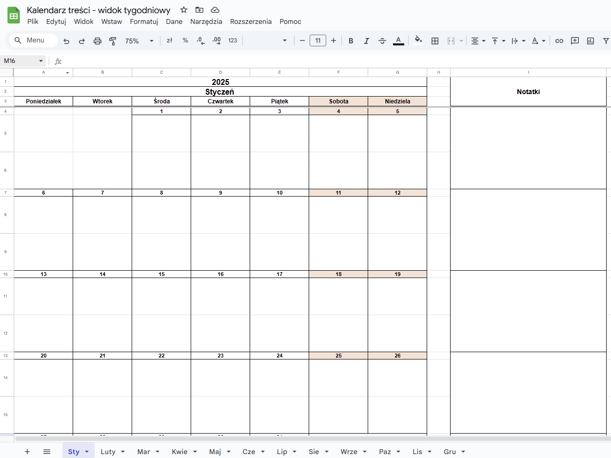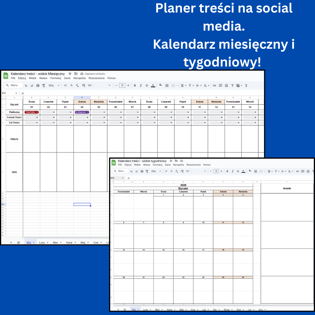 Pakiet Arkuszy do Planowania Treści – Widok Miesięczny i Tygodniowy
